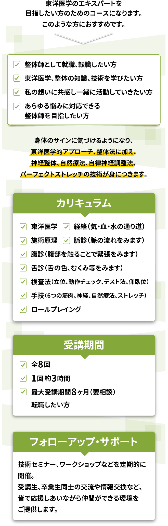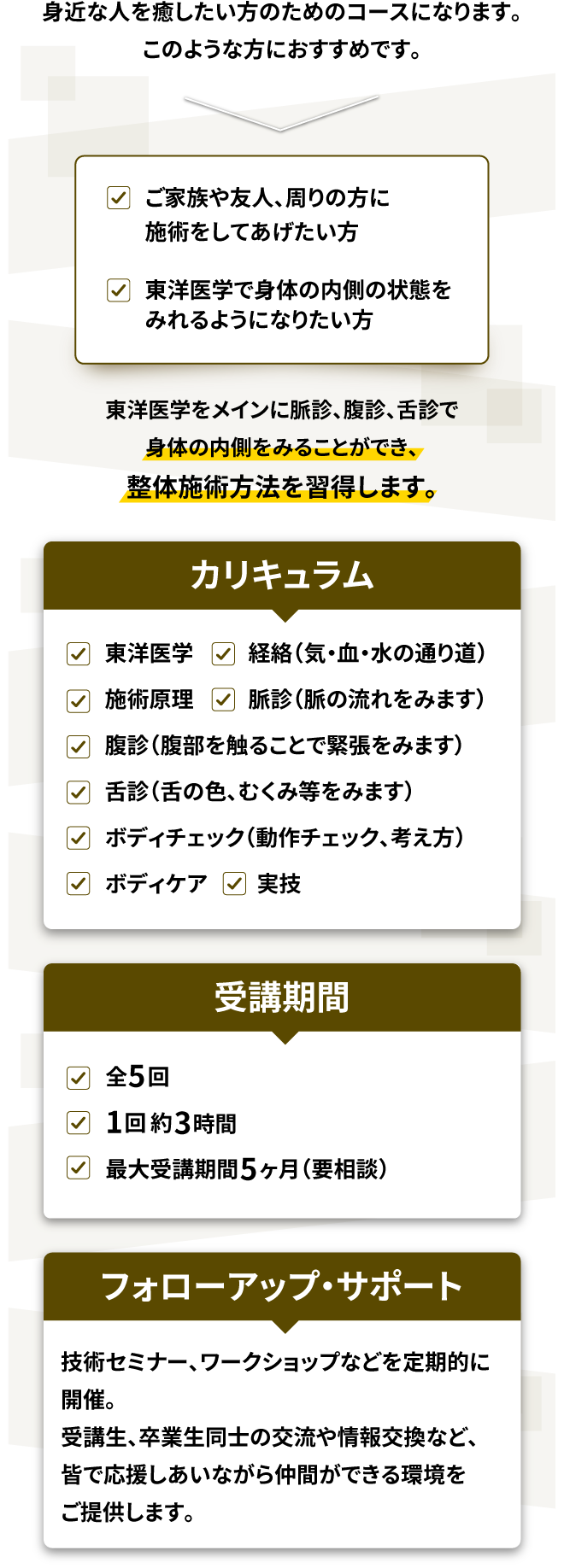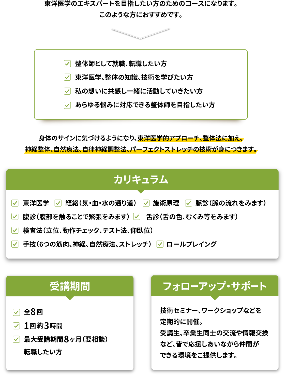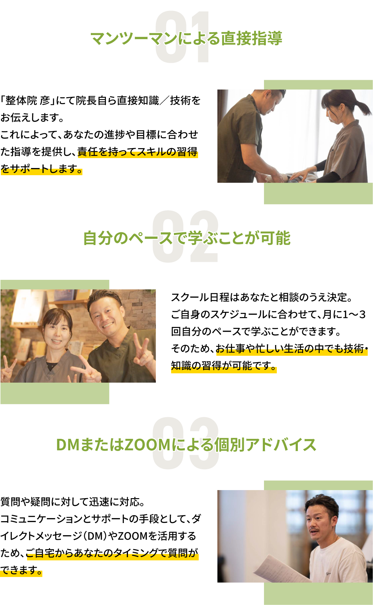 さらに、肩こり・腰痛・股関節痛・膝痛改善など様々な痛みに対応できる技術の習得も可能です。