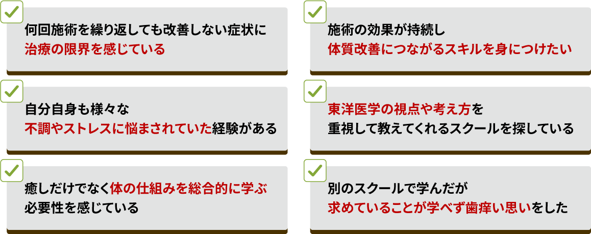 当スクールでは病気になる前に、身体・心のサインに気づき改善する東洋医学の知識が学べます。