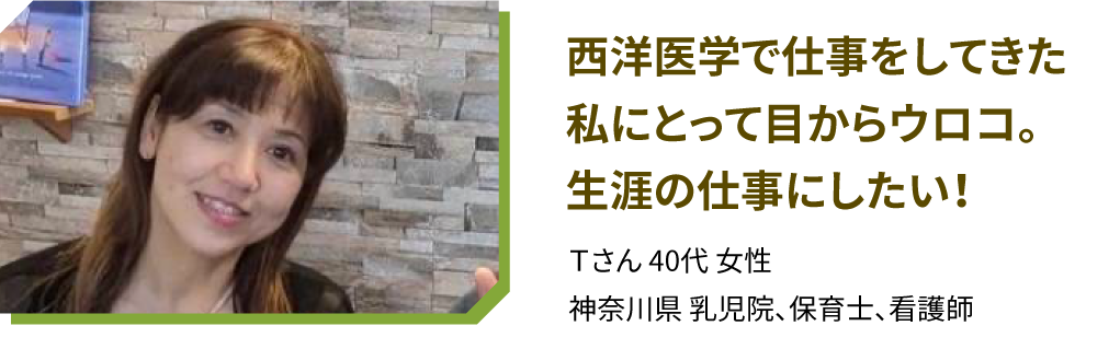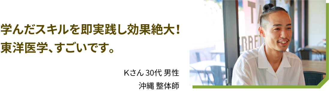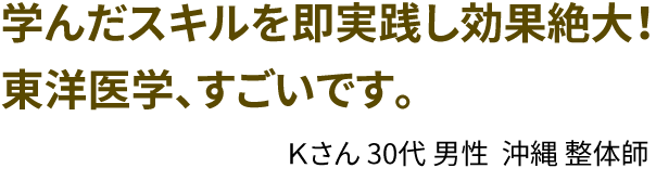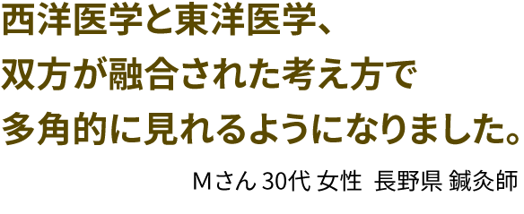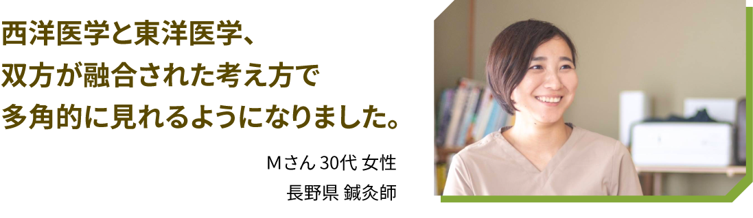 整体はどちらかというと、筋肉や腱など現代医学的な見立てのみでお体をみていくのですがげんき先生の技術は西洋医学と東洋医学で別々の視点で別々の施術をするのではなく、きちんと双方が融合された考え方なので1人の患者さんをすごく多角的に見れるようになりました。